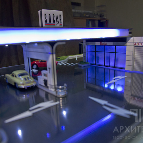 Архітектурний макет виготовлений для подарунка директору мережі АЗС Socar. Макет оснащений, декоративним захисним ковпаком з акрилу, світлодіодним підсвічуванням з зовнішнім блоком живлення.