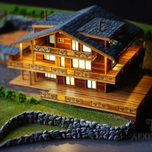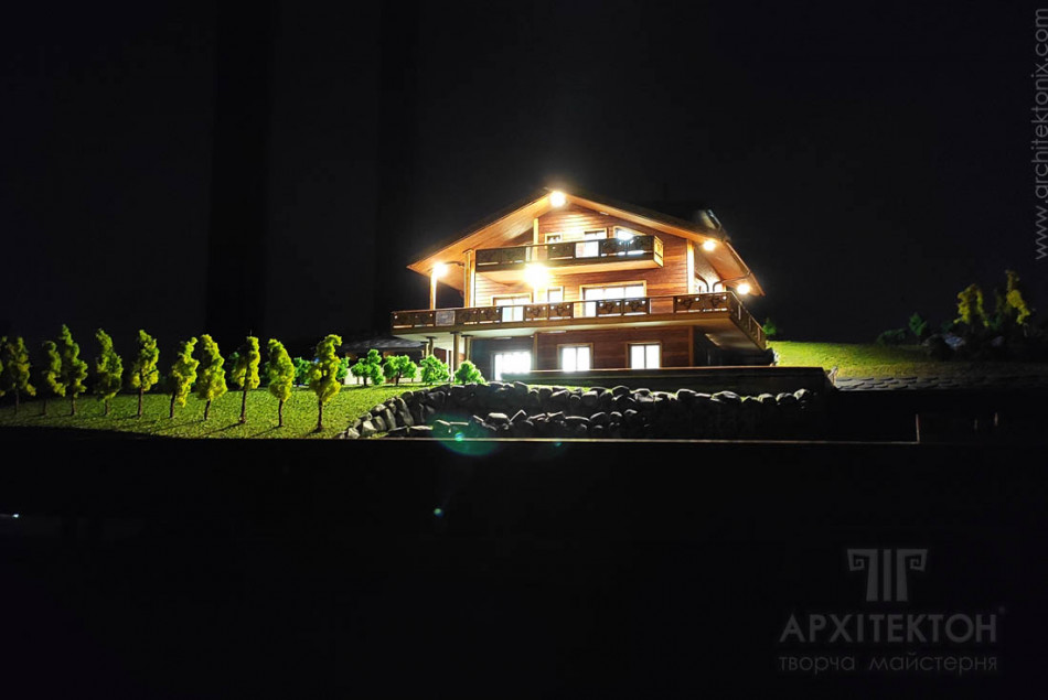 made for a private customer from natural materials: several types of wood (beech, maple, ash, oak, zebrano veneer) as well as natural stones, copper and plywood. Several shades of LED lighting were used to accurately simulate the backlighting.